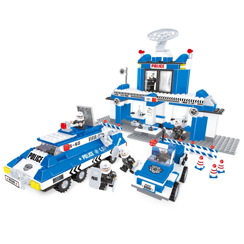 Голям детски конструктор за сглобяване Полицейски управление, изработен от качествена и безвредна пластмаса в бяло и синьо с включени шест фигурки на полицаи.