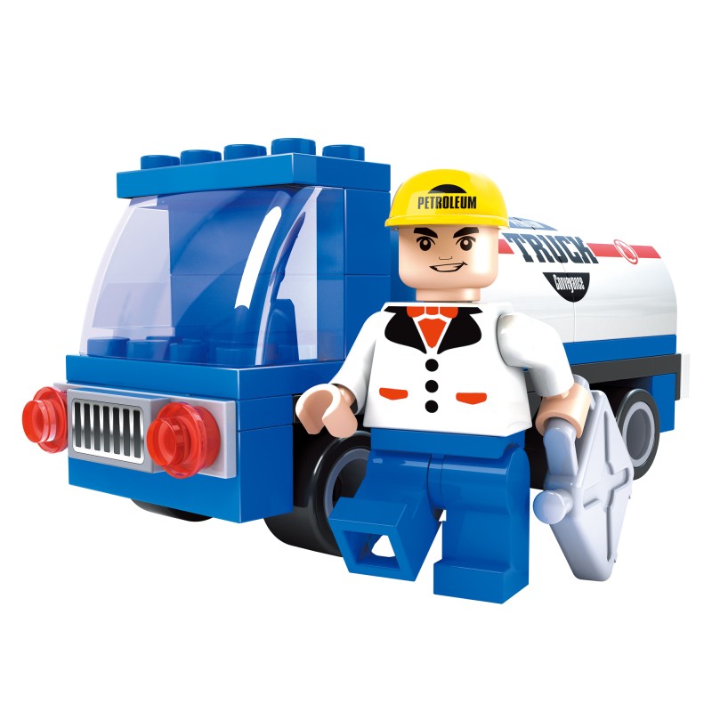 Детски конструктор за сглобяване цистерна, изработен от здрава и напълно безвредна пластмаса в синьо и бяло с включена фигурка на шофьор.
