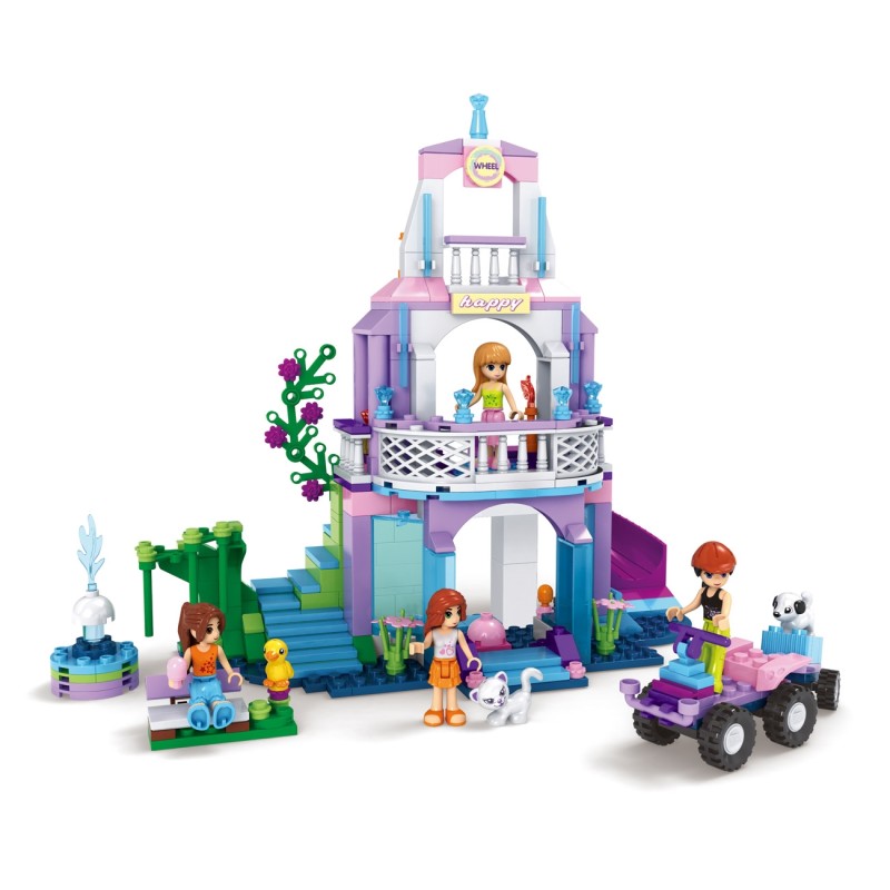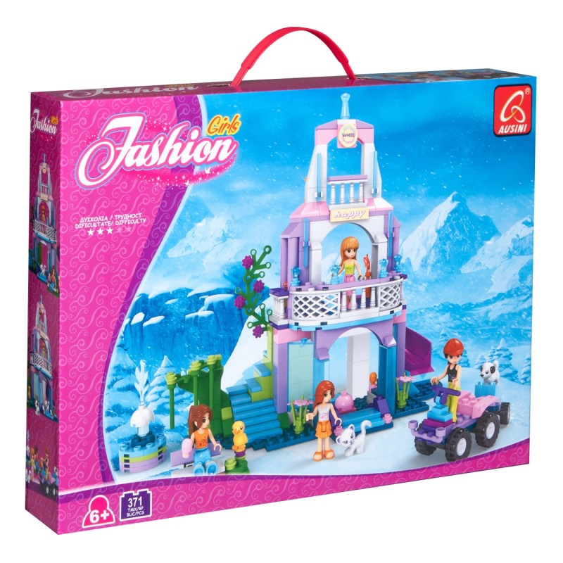 Детски конструктор за сглобяване Fashion girls - Замък на три нива, изработен от здрава и напълно безопасна пластмаса в лилави нюанси заедно с четири фигурки на момичета и автомобил.
