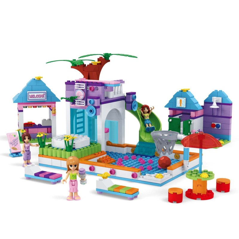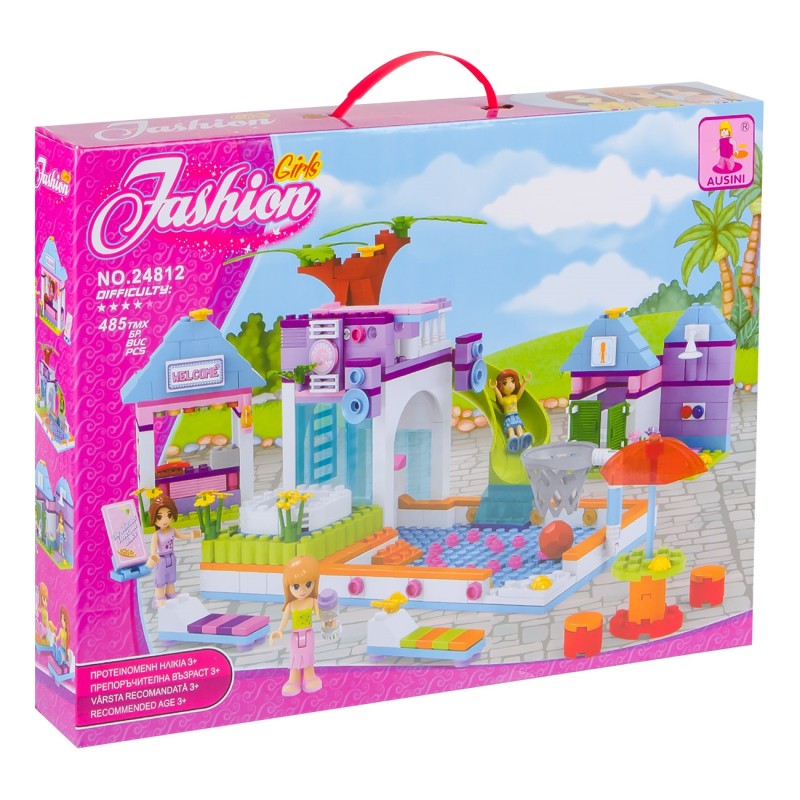Голям детски конструктор за сглобяване Fashion girls - аквапарк, изработен от качествена и безопасна пластмаса в различни цветове заедно с три фигурки на момиченца.