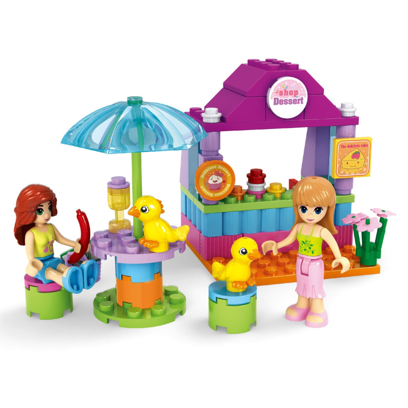 Детски конструктор за сглобяване Fashion girls - Сладкарница, изработен от качествена и безвредна пластмаса в различни цветове заедно с четири фигурки - на две момичета и две пиленца.