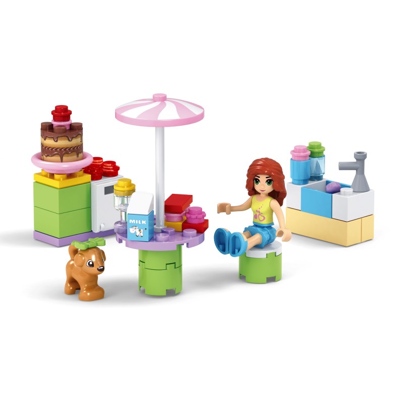 Детски конструктор за сглобяване Сладкарница, изработен от устойчива и безопасна пластмаса в различни цветове заедно с две фигурки - на момиченце и куче.