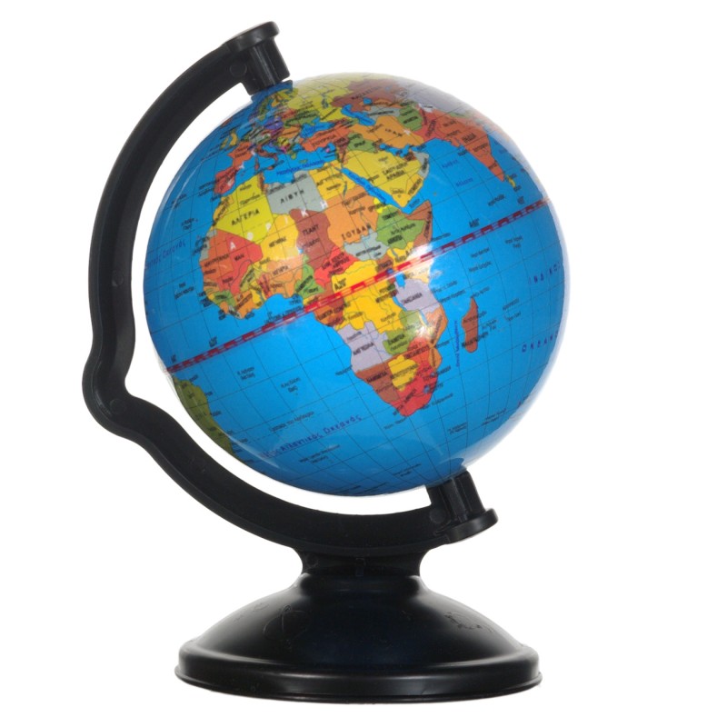 Малък глобус с политическа карта на света, изработен от здрава пластмаса.
