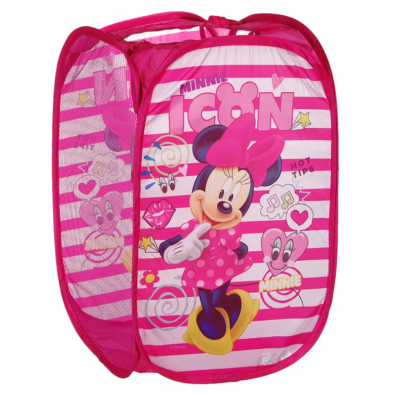 Детски кош за играчки, дрехи, аксесоари и други в розов цвят с картинка на любимата анимационна героиня на всяко малко момиченце - Мини Маус. Две от страните на коша са мрежести.