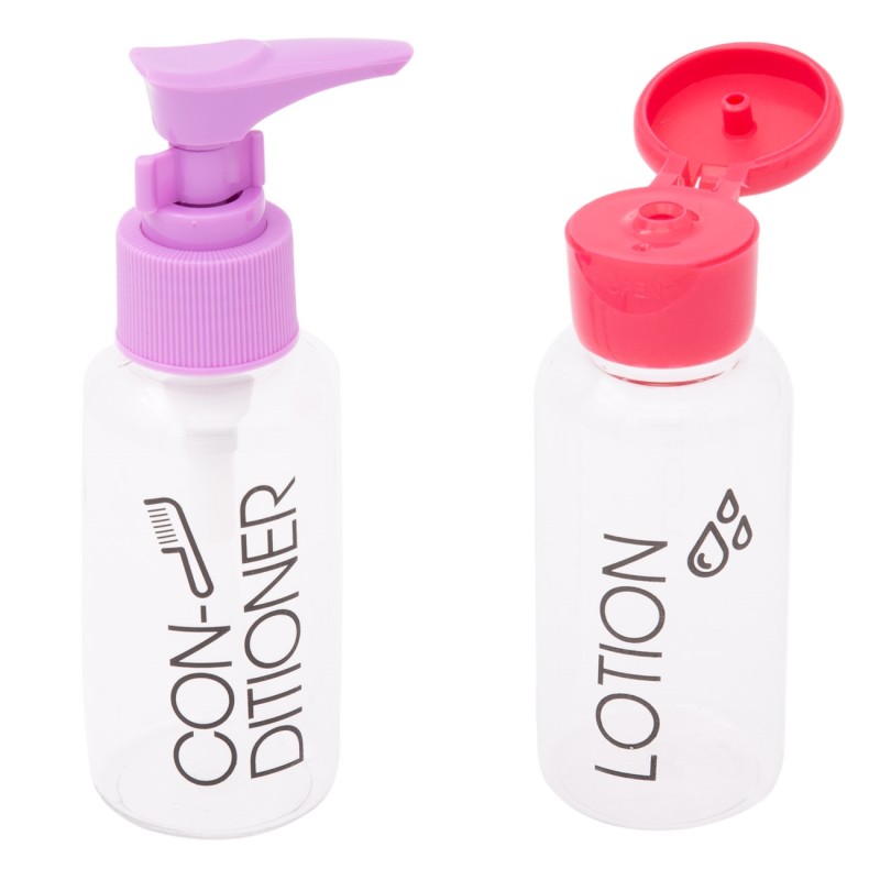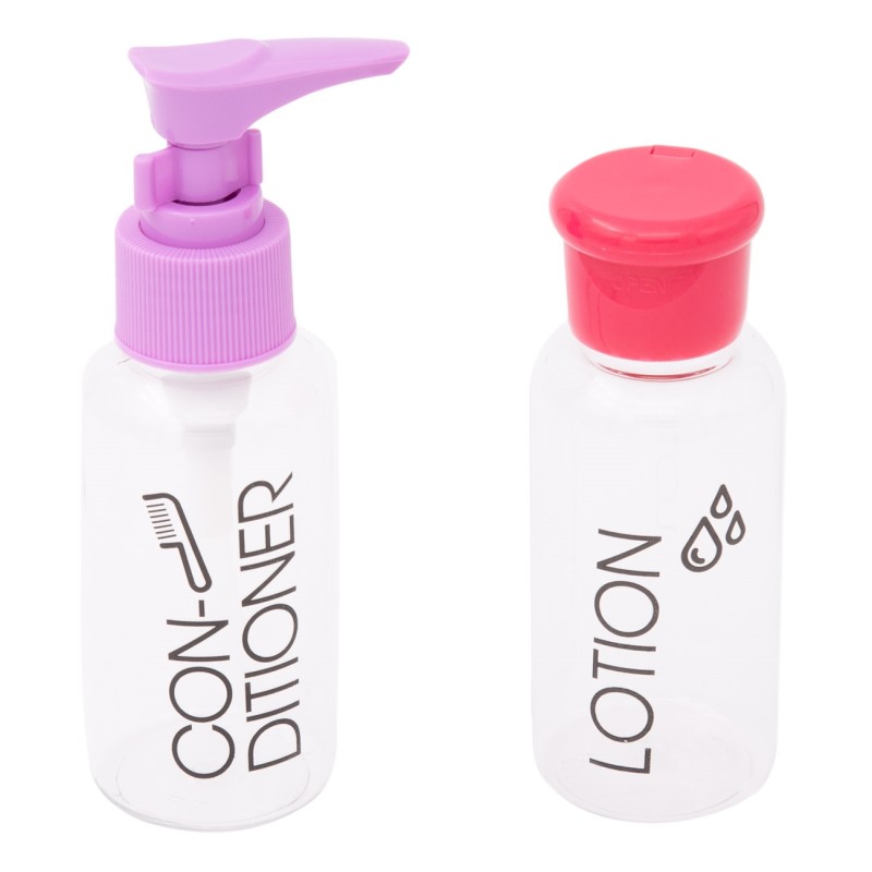 Комплект от 2 броя презареждащи се флакони за лосион и балсам за коса, изработени от прозрачна пластмаса.