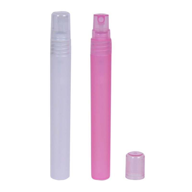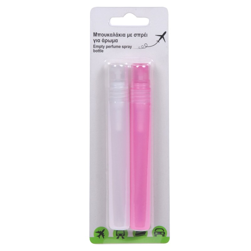 Комплект от 2 броя презареждащи се флакон за парфюм, изработени от прозрачна пластмаса в бяло и розово.