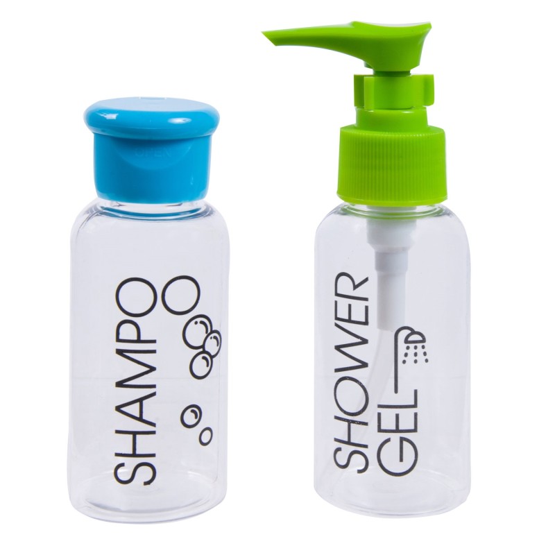 Комплект от 2 броя презареждащи се флакони за шампоан и душ гел, изработени от прозрачна пластмаса.
