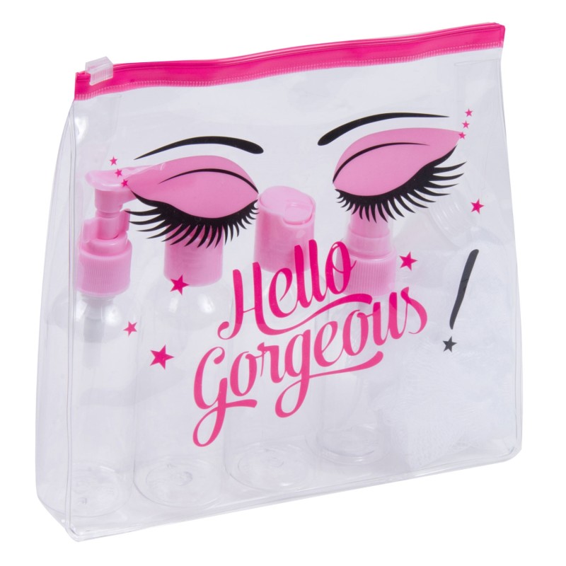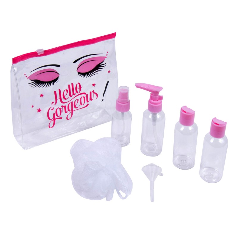 Козметичен комплект за пътуване, състоящ се от 4 мини флакона за парфюм, шампоан, балсам и душ гел (80 мл.), мини гъба за баня и капкомер тип фуния, изработени от прозрачна пластмаса в практичен прозрачен несесер с цип.