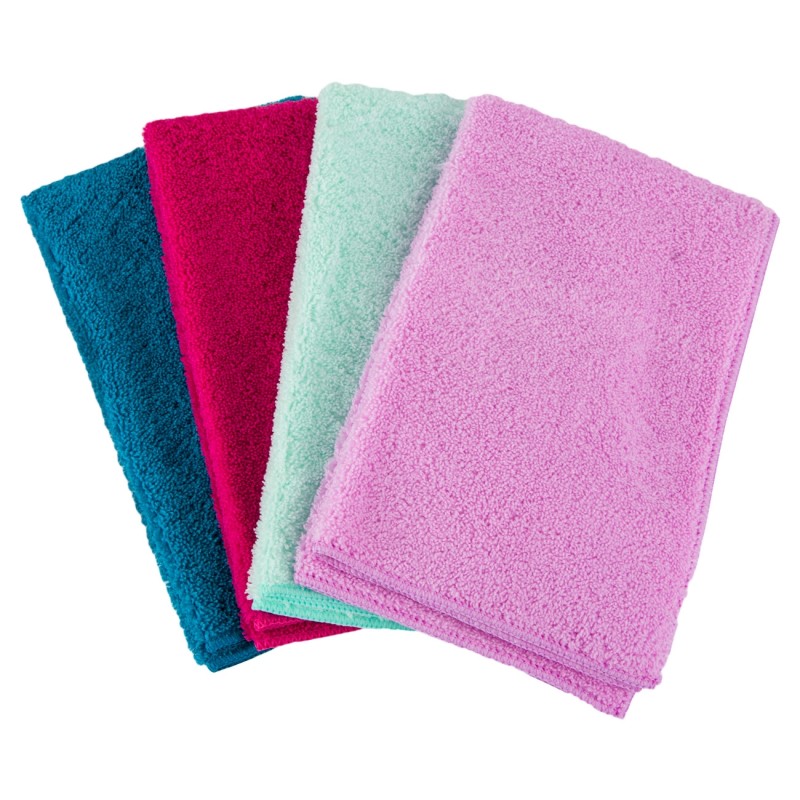 Комплект от 4 броя кухненски кърпи с микрофибърни влакна в различни цветове - синьо, червено, резедаво и лилаво, подходящи за почистване на кухненски електроуреди и подсушаване на съдове.