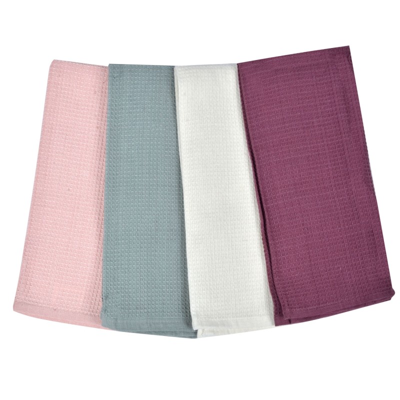 Комплект от 4 броя кухненски кърпи в различни цветове - розов, сив, екрю и лилав, изработени от висококачествени материали, което гарантира тяхната постоянна мекота и лесна поддръжка.