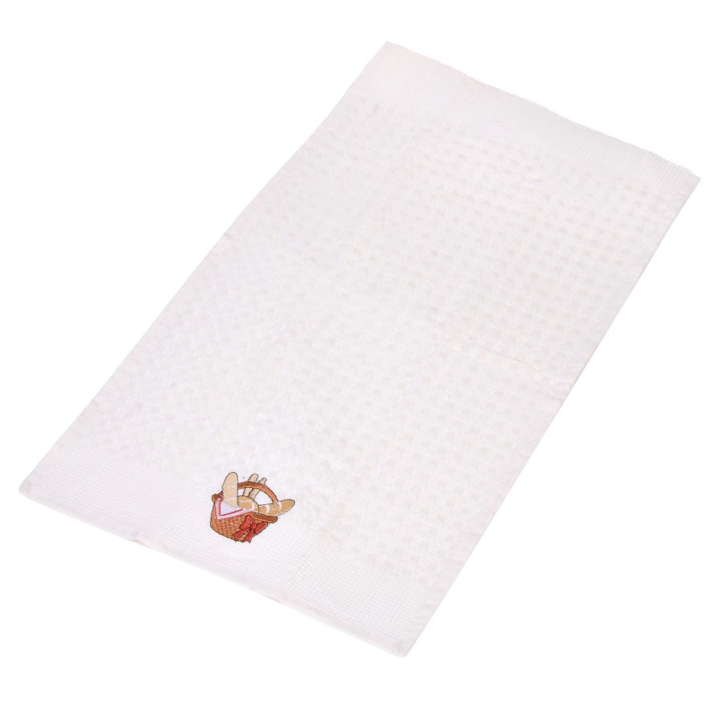 Кухненска кърпа в бял цвят с дискретна бродерия на кошница с франзели, изработена от висококачествена, мека, плътна нишка с висока абсорбираща способност.