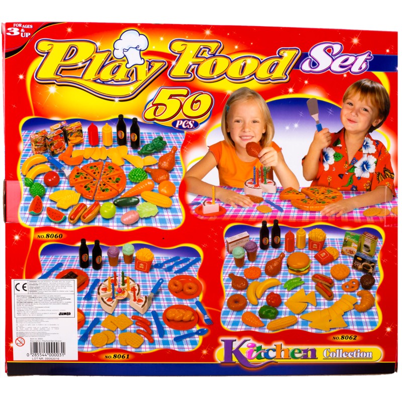 Голям детски комплект с различни ястия и хранителни продукти с реалистичен дизайн, изработени от здрава и безвредна пластмаса.