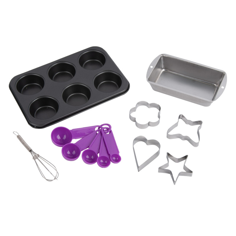 Детски сладкарски комплект, включващ бъркалка, различни по големина мерителни лъжички, форми за сладки, форма за кекс и за мъфини.