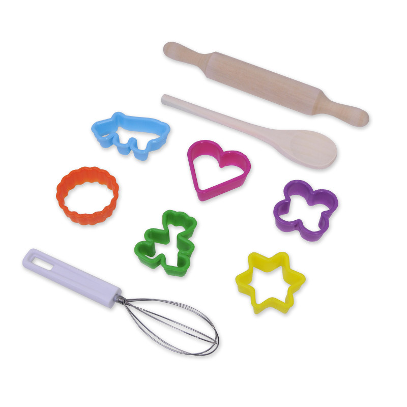 Детски комплект за приготвяне на сладки и курабийки, включващ бъркалка, дървена лъжица, точилка и разноцветни пластмасови формички за сладки.