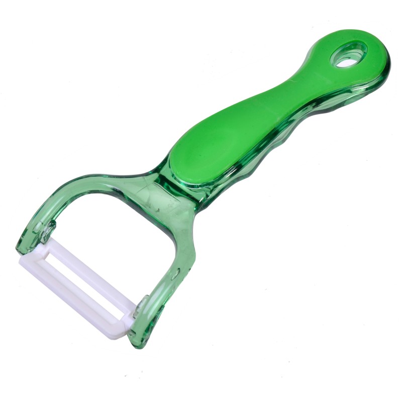 Универсална белачка за зеленчуци с висококачествено керамично острие и ергономична пластмасова дръжка в зелен цвят за максимално удобен захват без опасност от приплъзване.
