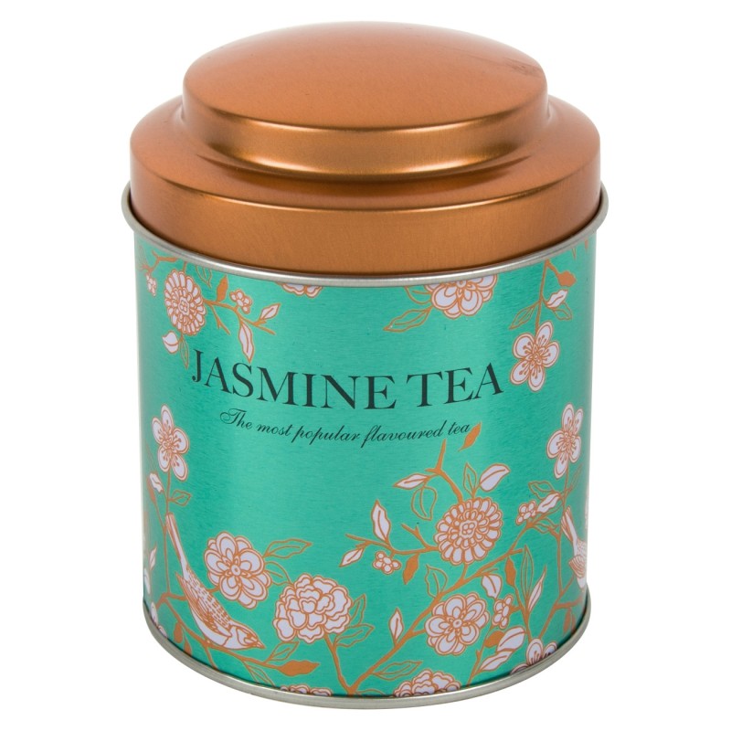 Метална кутия в резедав цвят за съхранение на чай със златист капак, осигуряващ плътно затваряне, което гарантира дълготрайното запазването на аромата му.