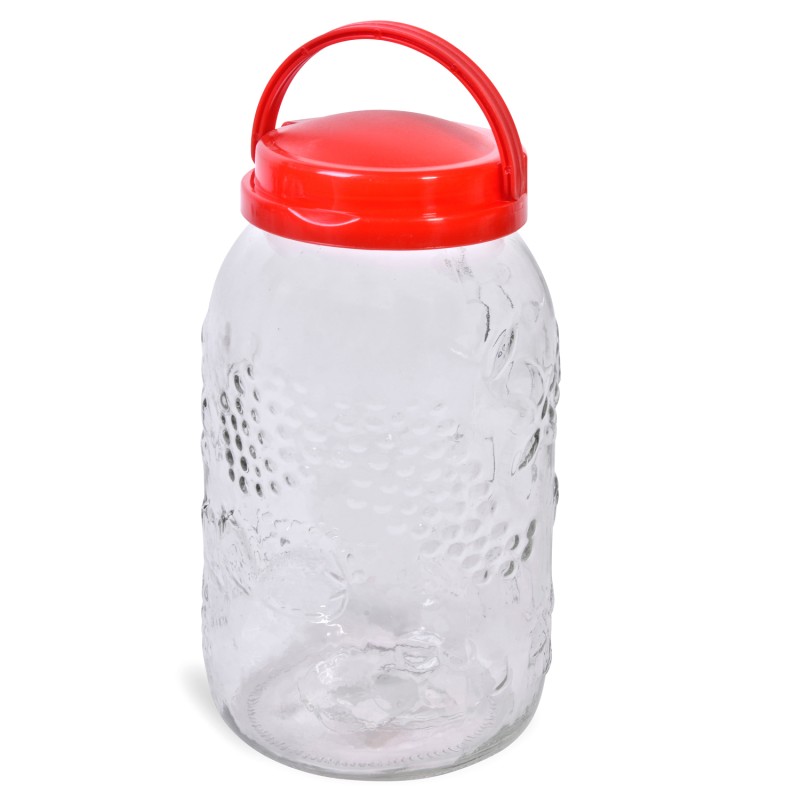 Стъклен буркан с удобна дръжка за носене и цветен пластмасов капак, осигуряващ плътно затваряне без опасност от разсипване.