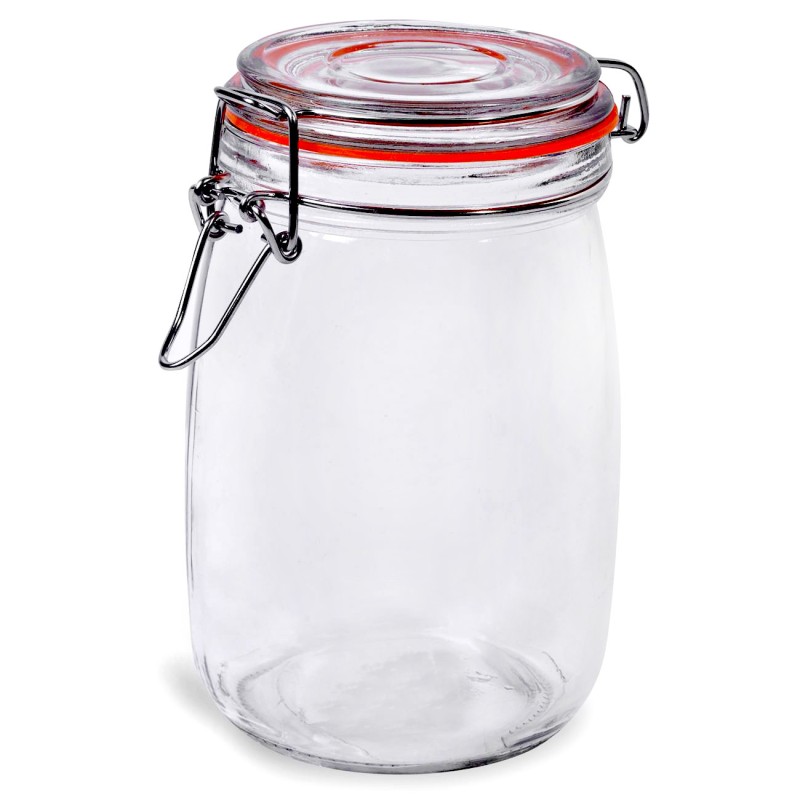 Стъклен буркан с капак и метален механизъм, гарантиращ плътно затваряне, което осигурява дълготрайна свежест на продуктите в него.
