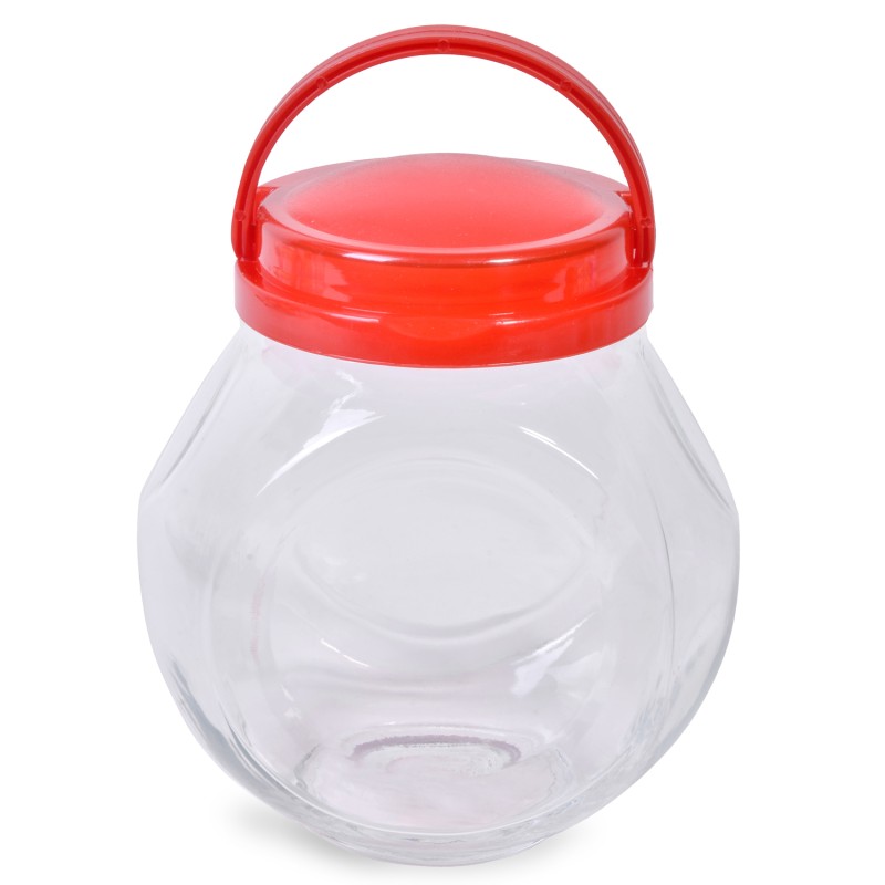 Стъклен буркан във формата на сфера с практична дръжка и цветен пластмасов капак, гарантиращ плътно затваряне без опасност от разсипване.