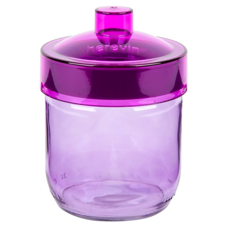 Цветен стъклен буркан с капак, осигуряващ плътно затваряне, което запазва свежестта на продуктите в него.