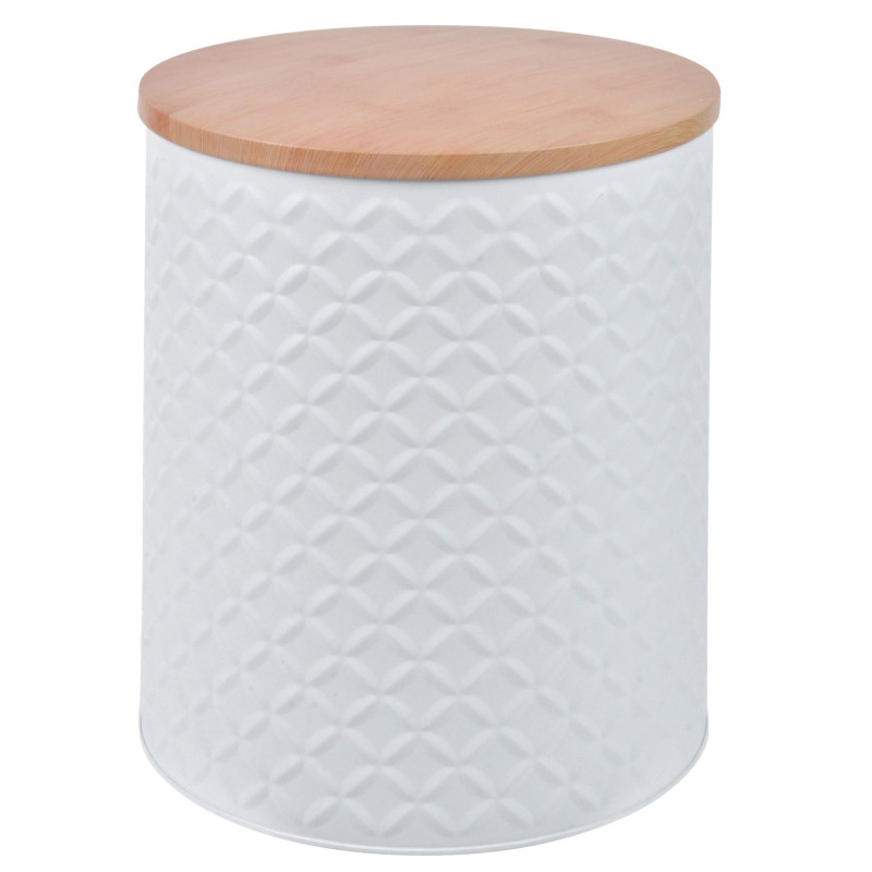 Цилиндрична метална кутия за съхранение с капак, осигуряващ плътно затваряне без опасност от разсипване.