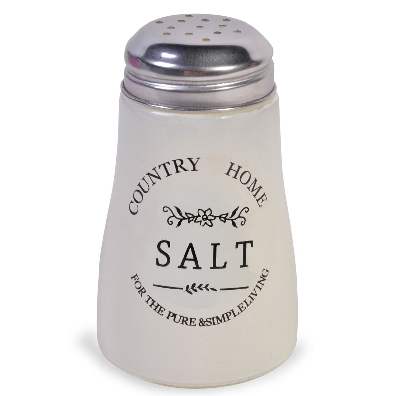 Класическа порцеланова солница в бял цвят с метална капачка на винт в сребрист цвят.