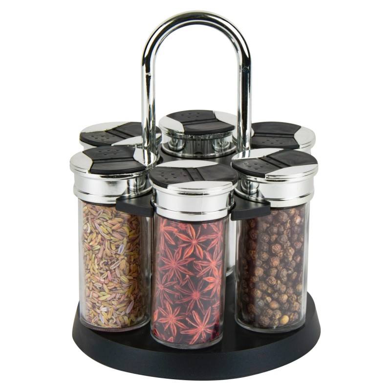 Комплект от 6 броя стъклени стъклени съдове за подправки тип солница с метални капачки в масивна метална поставка с удобна дръжка. Подходящи за овкусяване на ястия и салати.