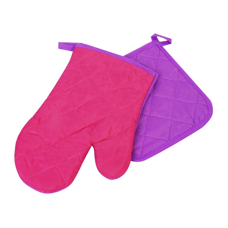 Кухненски комплект от топлоизолационна ръкавица и ръкохватка за горещи съдове, изработени от висококачествени материали в лилаво и розово.
