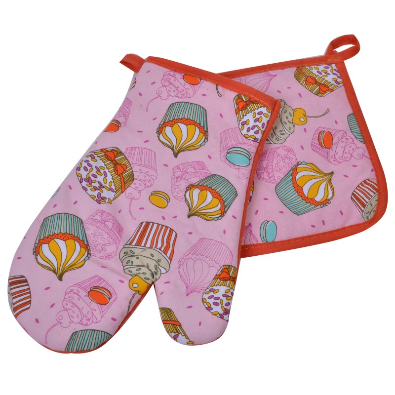 Кухненски комплект от топлоизолационна ръкавица и ръкохватка за горещи съдове, изработени от висококачествен памук в розов цвят с тематична щампа на мъфини.