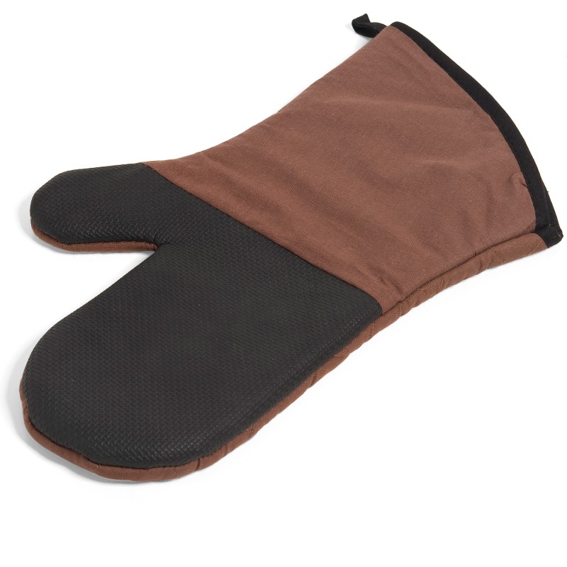 Кухненска топлоизолационна ръкавица за горещи съдове, изработена от висококачествени материали в кафяв цвят с каучуково покритие в предната част.