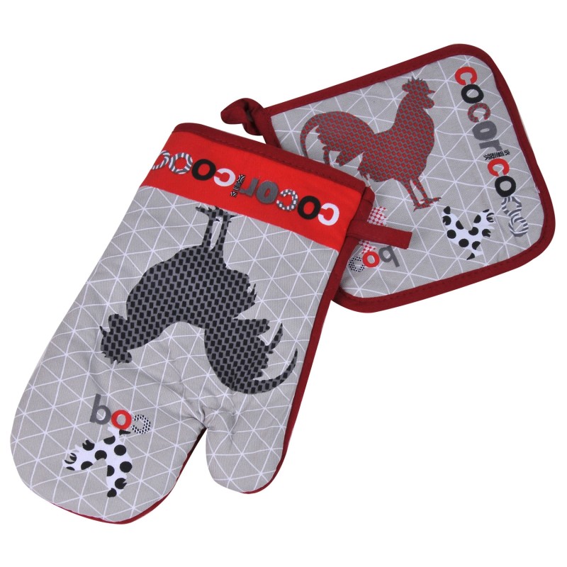 Кухненски комплект от топлоизолационна ръкавица и ръкохватка за горещи съдове, изработени от висококачествен памук в сив цвят със забавна щампа на петел.