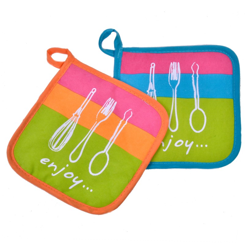 Кухненски комплект от 2 броя топлоизолационни ръкохватки за горещи съдове, изработени от висококачествен памук в многоцветно райе с тематична щампа на кухненски прибори.