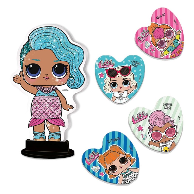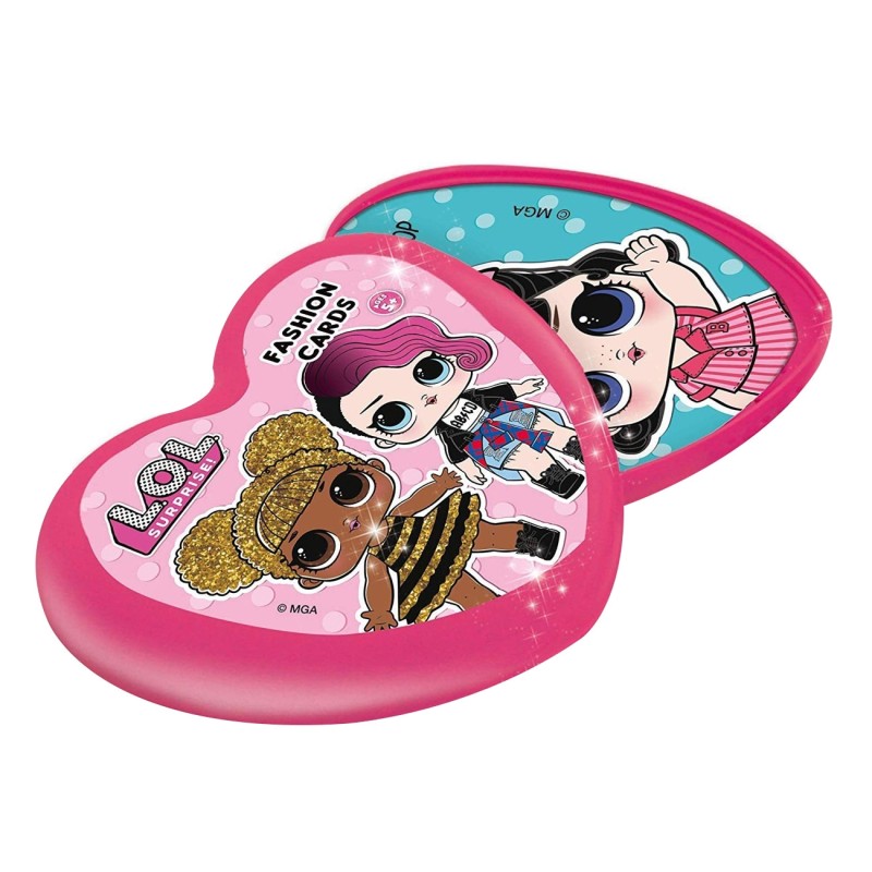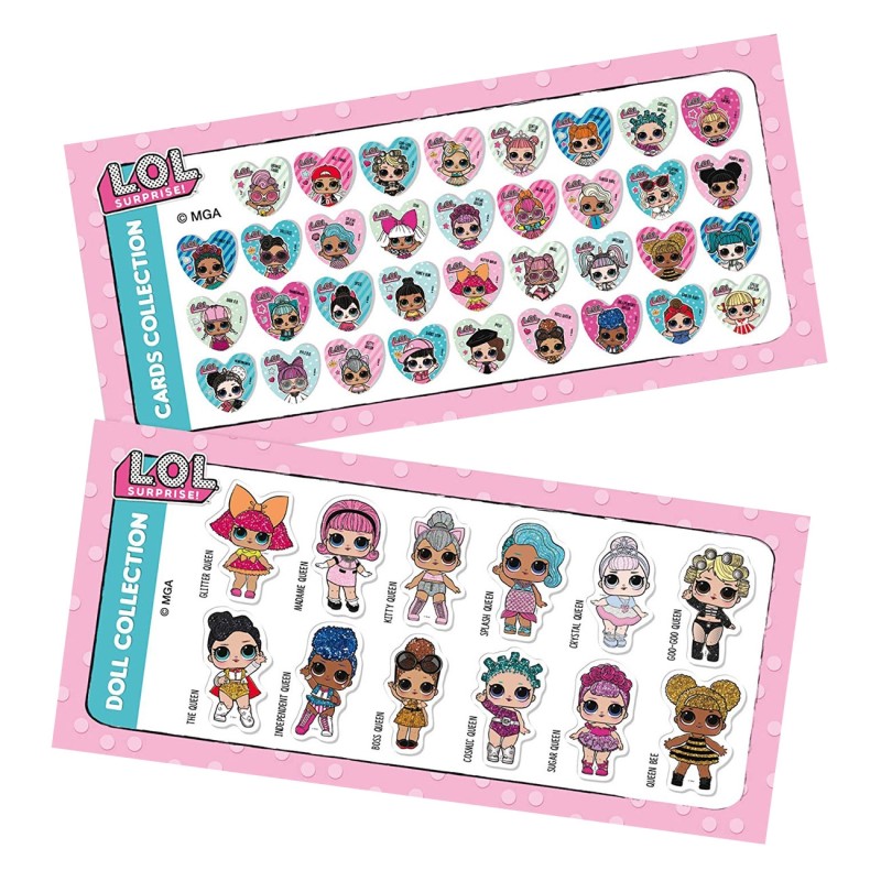 Детски комплект LOL Surprise, включващ 7 модни картички, една фигурка с блестящи брокатени частици и пластмасова поставка, брошура със стикери и упътване.
