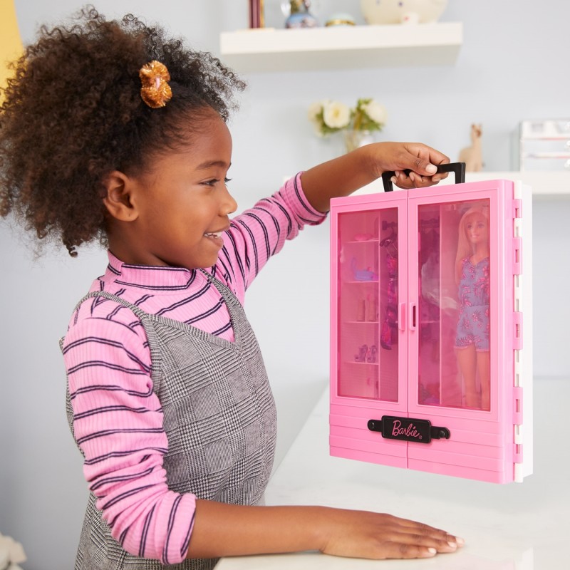 Детски комплект, включващ кукла Барби с красива рокля на цветя + гардероб-куфарче с рокли за преобличане в различни цветове и множество аксесоари - дамски чанти, няколко чифта обувки и бижута.
