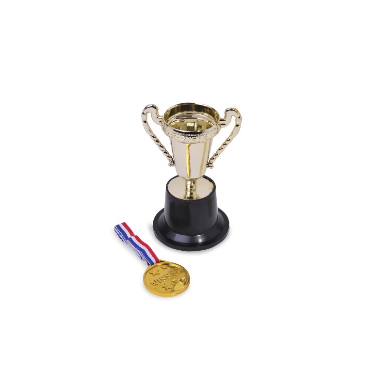 Шампионски комплект - купа и златен медал, изработени от качествена и здрава пластмаса с трицветна връзка за врата.