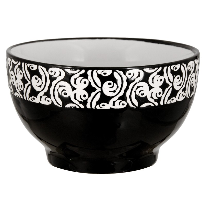 Купа за ориз, изработена от висококачествена керамика в черен цвят с красиви декоративни шарки в бял цвят.