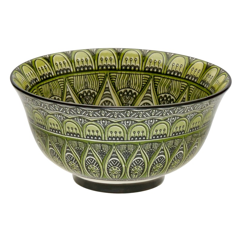 Компактна и удобна купа за сервиране, изработена от висококачествена керамика със стилизирани флорални орнаменти в зелени нюанси отвън и отвътре.