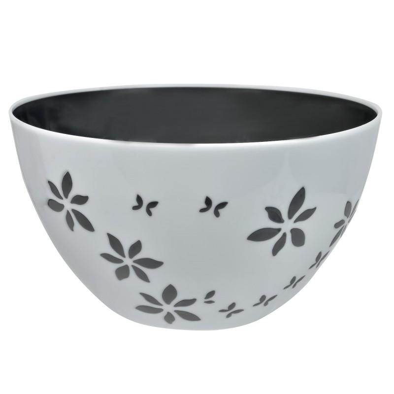 Универсална купа, изработена от качествена пластмаса в бял цвят със стилизирани флорални мотиви и черни вътрешност.