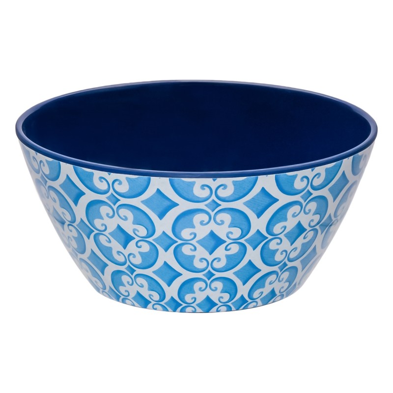 Универсална купа за хранене и сервиране, изработена от меламин с красиви декоративни шарки в цвят тюркоаз със синя вътрешност.