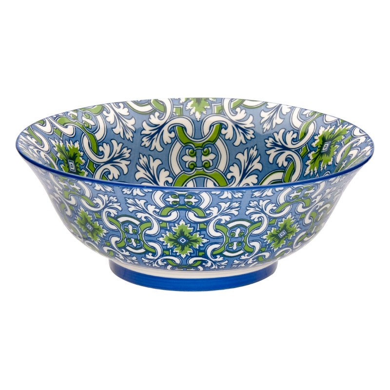 Универсална купа за сервиране, изработена от висококачествена керамика в син цвят с красиво преплетени флорални орнаменти в бяло и зелено отвън и отвътре.