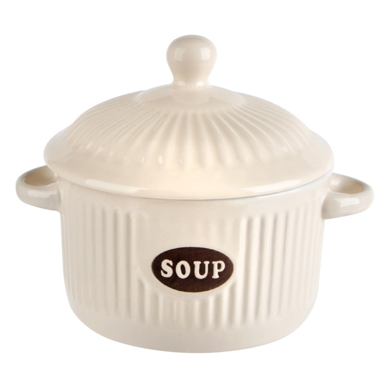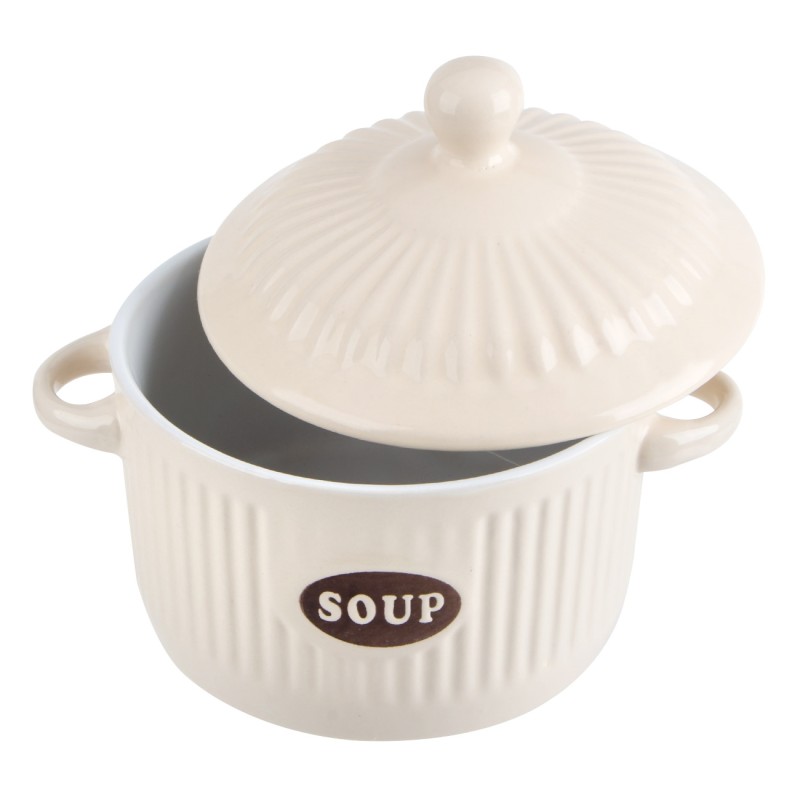 Купа за супа с дръжки и капак, изработена от термоустойчива керамика в цвят екрю с надпис Soup.