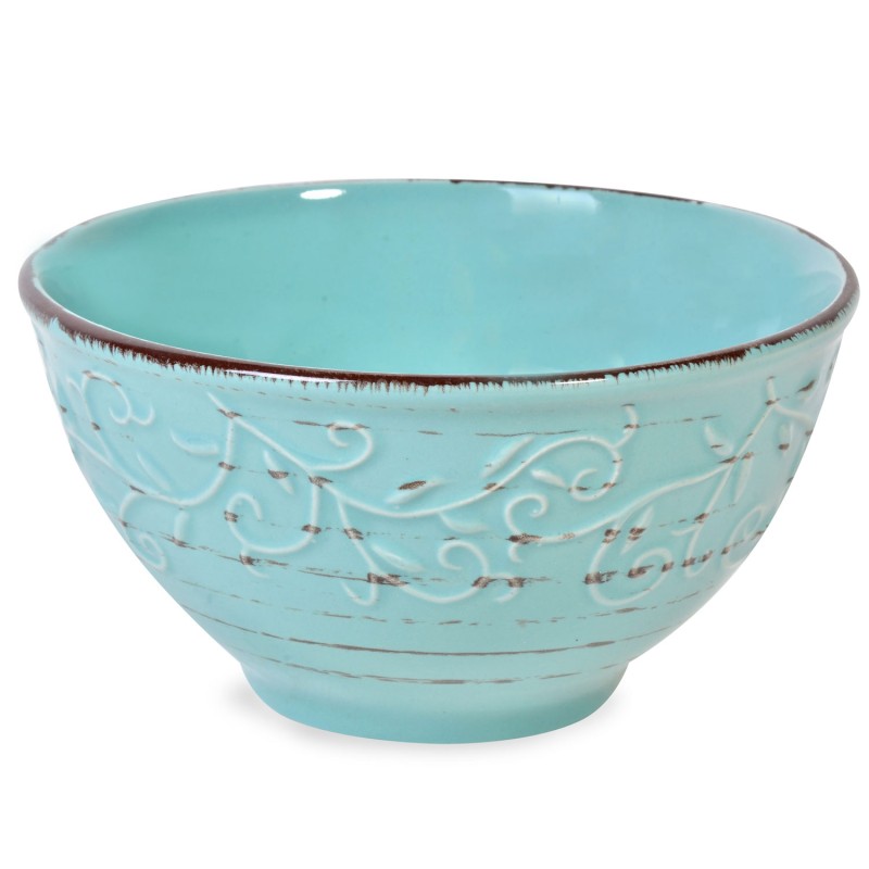 Купа за салата, изработена от висококачествена керамика в резедав цвят с релефни флорални шарки на външната страна.