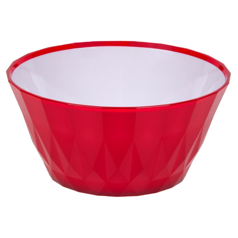 Практична салатиера, изработена от здрава и устойчива пластмаса в червен цвят с бяла вътрешност.