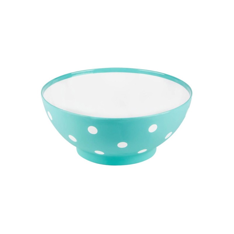 Практична и компактна купа за хранене и сервиране, изработена от здрава и устойчива пластмаса в светло син цвят на бели точки.