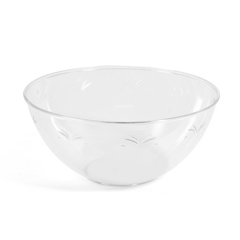 Практична и дълбока купа за хранене и сервиране за еднократна употреба, изработена от здрава прозрачна пластмаса с релефни флорални шарки.