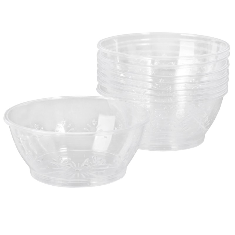 25 броя универсални купи за хранене и сервиране, изработена от здрава и плътна прозрачна пластмаса с релефни декоративни цветя.
