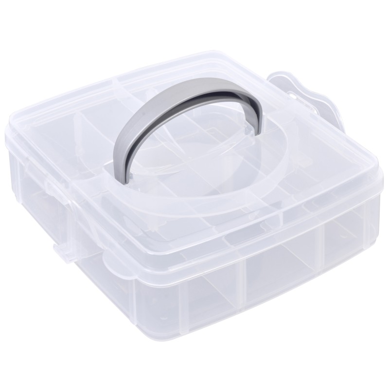 Квадратна кутия-органайзер за съхранение изработена от висококачествена полупрозрачна пластмаса в бял цвят с отделения и капак.