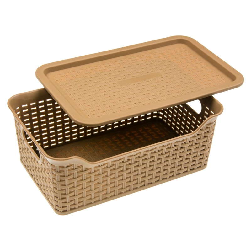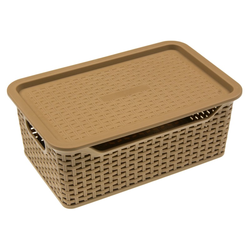 Практична кошница за съхранение тип касетка, изработена от висококачествена пластмаса, която имитира плетка в кафяв цвят с ергономични дръжки за лесно носене и капак.