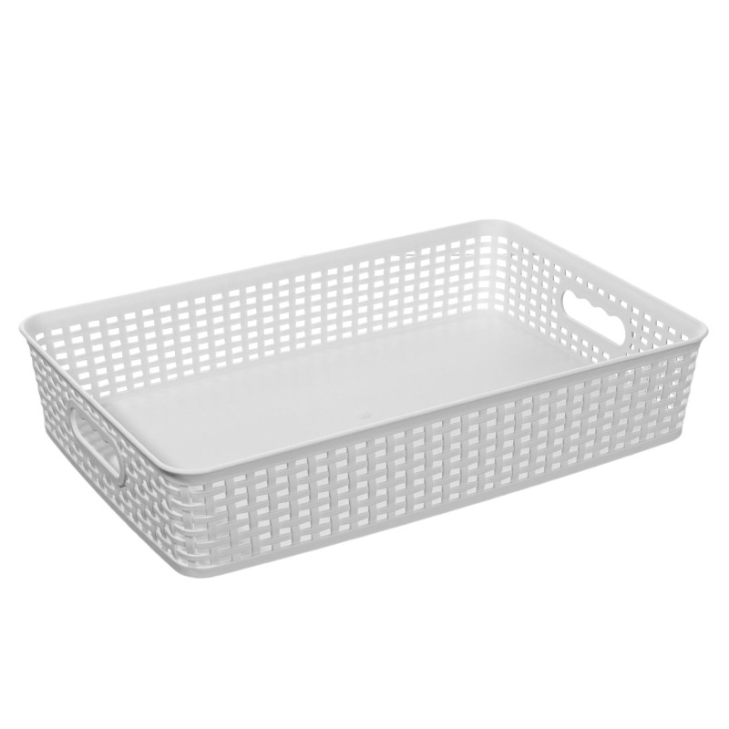 Практична кошница за съхранение тип касетка, изработена от устойчива пластмаса, която имитира ратанова плетка в бял цвят с ергономични дръжки за лесно носене.
