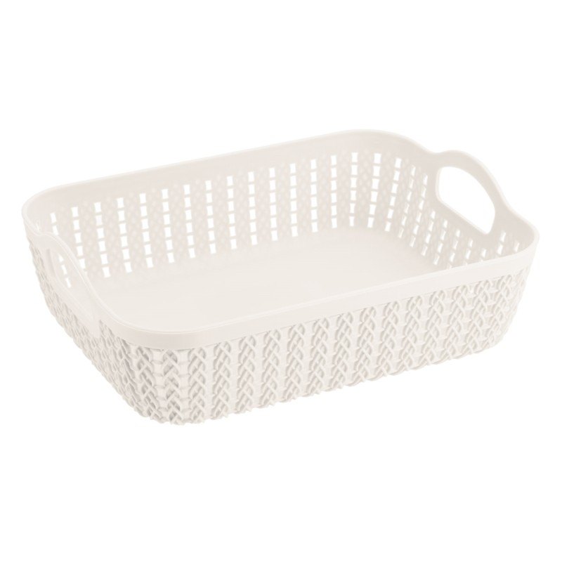 Практична кошница за съхранение тип панер, изработена от висококачествена пластмаса, която имитира плетка в бял цвят с ергономични дръжки за лесно носене.